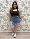Skort de jean desflecada, con faldón semi tableado y cinto con hebilla.